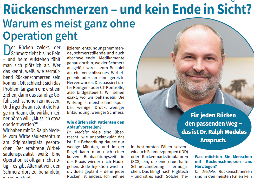 „Bei Rückenschmerzen ist die präzise Diagnostik das A und O“, sagt Dr. Ralph Medele. Der Neurochirurg und ärztliche Leiter des Wirbelsäulenzentrums am Stiglmaierplatz in München sieht jährlich mehr als 10.000